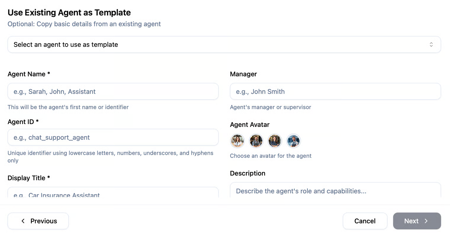 Connect an existing AI agent that your company already uses. This option allows you to integrate third-party agents or internal tools into the platform without rebuilding them from scratch.