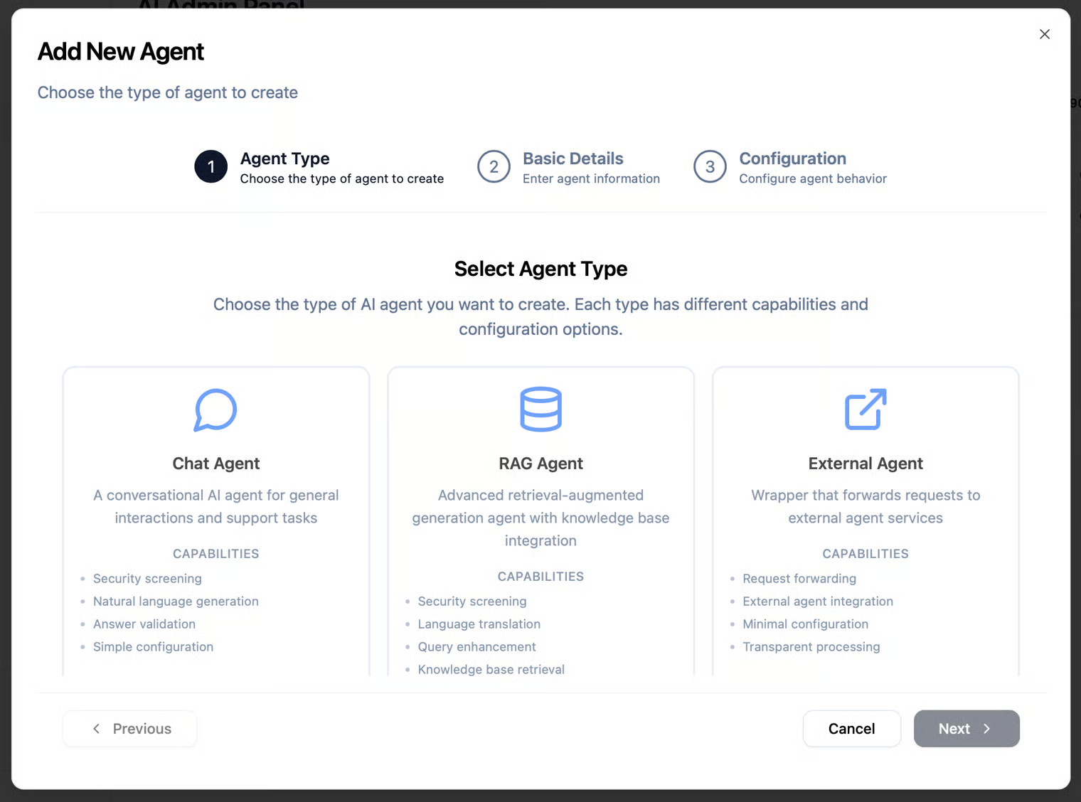 When you click the "Add Agent" button, you’ll see three agent options to choose from:
