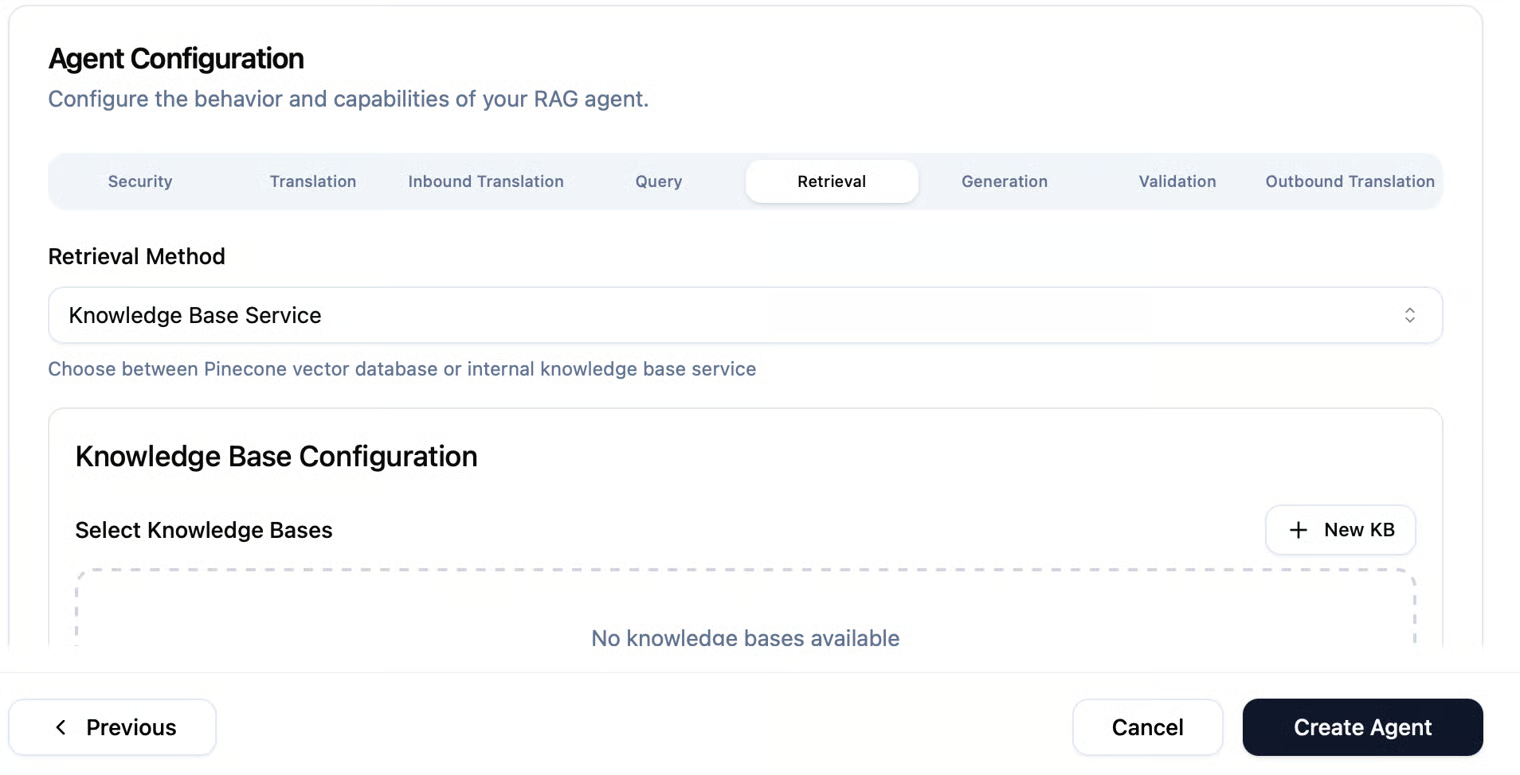 A RAG Agent can search through your company’s data or knowledge-bases (like documents or help articles) in real time and generate smart, accurate responses based on that information. What sets a RAG Agent apart from a Chat Agent is the “Retrieval” configuration step, which is available after you fill in the agent’s basic information. This allows the RAG Agent to access and search connected knowledge sources when generating responses.