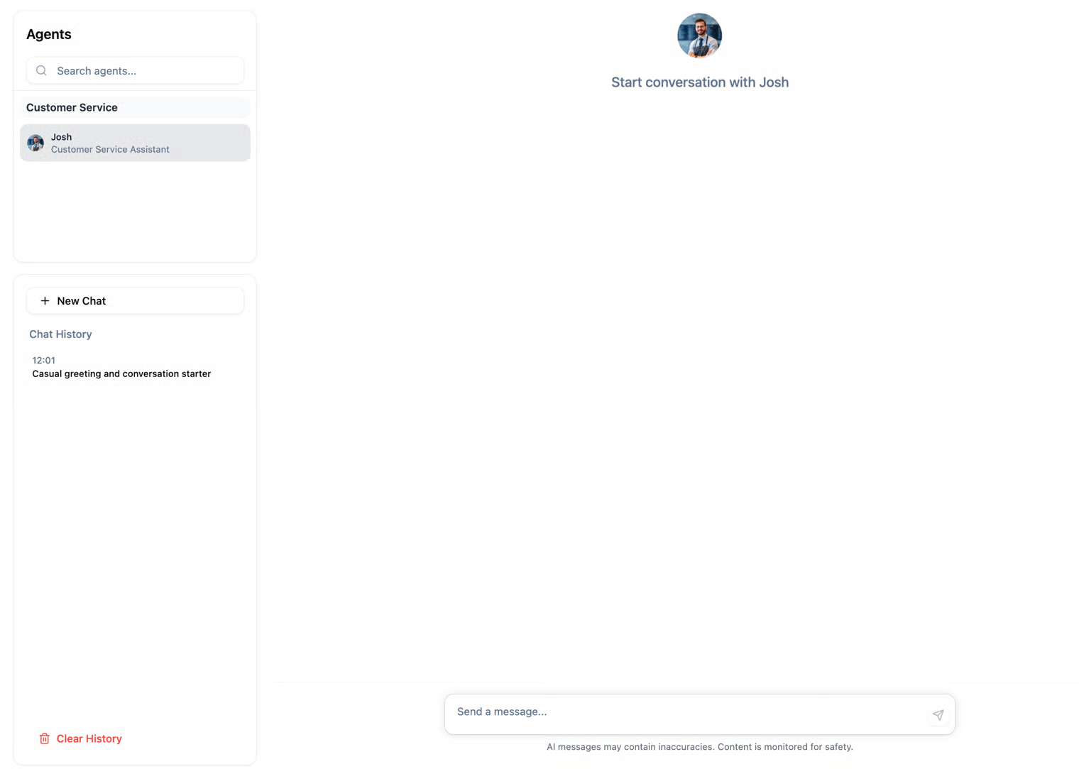When accessing the ״Chat With Agent" page, you’ll see a familiar chat interface with the AI agent. You can select which agent you’d like to talk to, review the full history of previous conversations, and start new chats at any time.