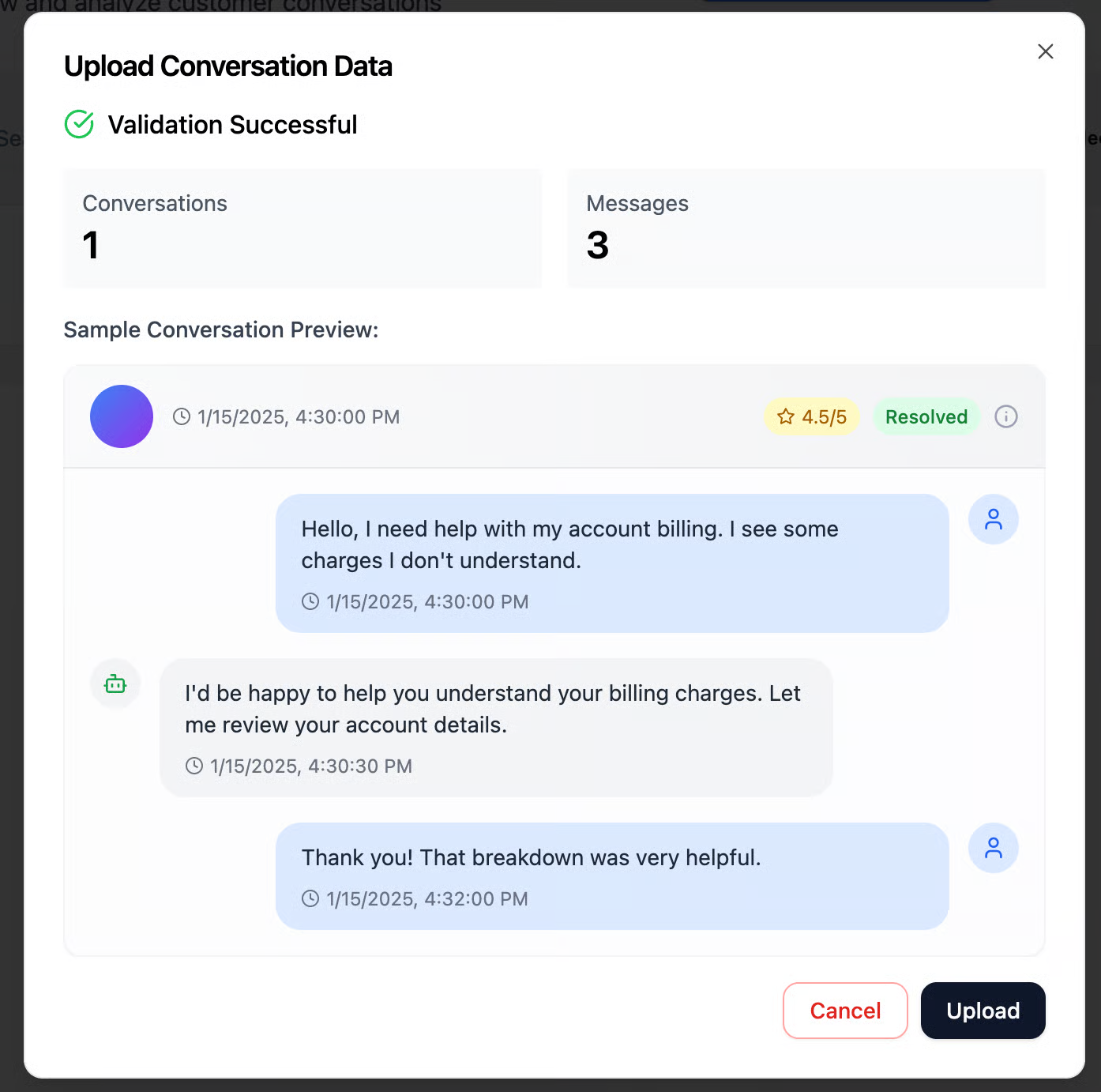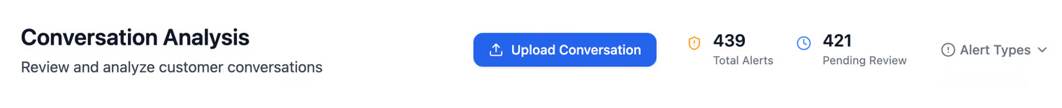 After reviewing the messages, you can click Upload to submit the conversation to the system. Once uploaded, the conversation will appear on the Conversation Analysis page, where models will evaluate its quality and check for any alerts that will determine its score