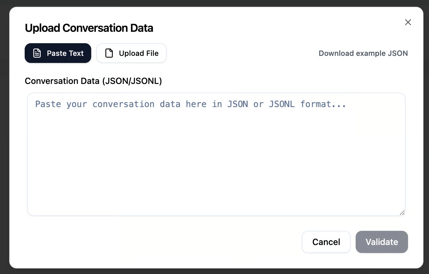 After uploading the file or pasting your conversation in JSON format, you can click the Validate button to preview how the conversation will appear before submitting it to the system.