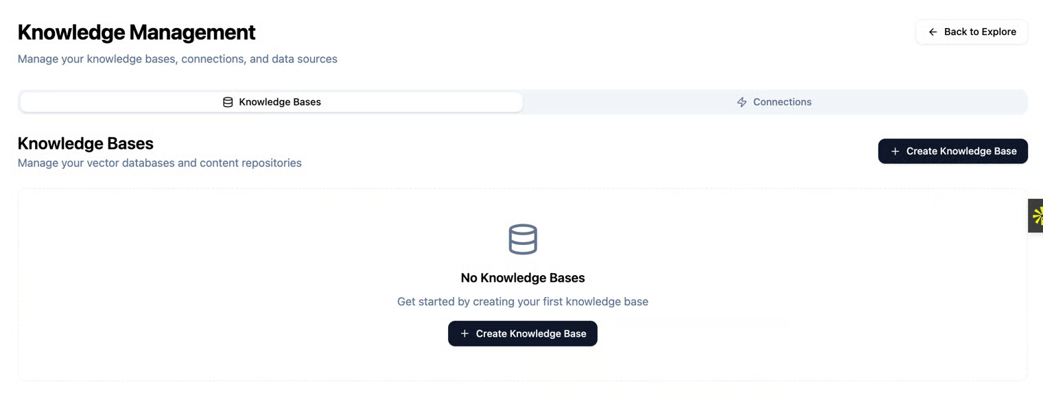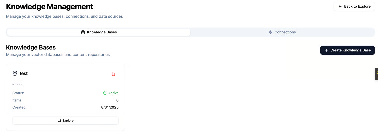 To create a new knowledge base, go to Manage KB. There, you can manage all your existing knowledge bases and create new ones as needed.