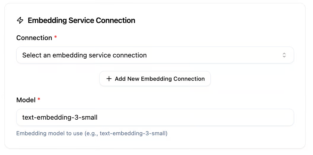 - Model – the embedding model that the service will use to convert the texts. The default is text-embedding-3-small. This is a fast and efficient model suitable for most cases of searching and retrieving information. If you want higher accuracy or a more advanced model, you can choose a different model from the service, but in most cases there’s no need to change the default.