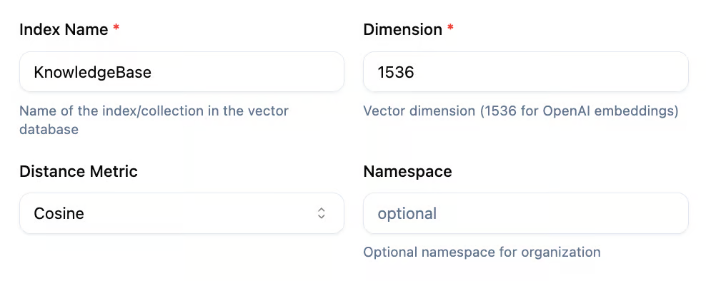 - Namespace (Optional) – allows you to organize your KB into internal folders or groups within the same index. For example, if you have multiple domains (Marketing, Technical Support, Product), you can create a separate namespace for each to keep the information organized. If you’re unsure, you can leave it blank and add a namespace later.
