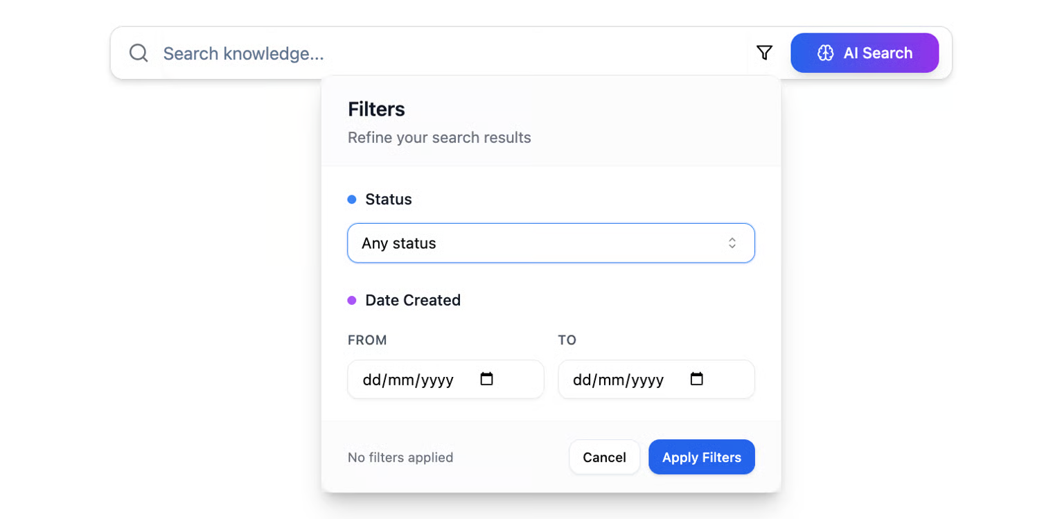 In the search bar at the top of the page, you can search all the information stored in your knowledge bases. You can filter by status and creation dates, and even use advanced AI-powered search to find the most relevant information for you.