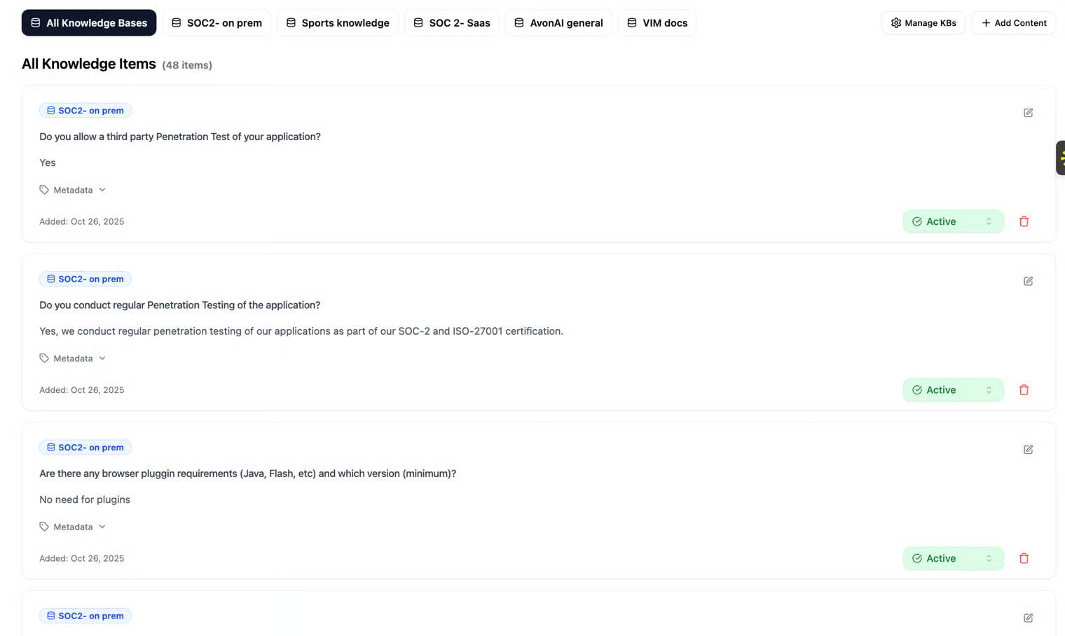 - Active/Inactive – Determines whether the item is available for your agent to use. When an item is Active, the agent can access and rely on it when generating responses. When an item is Inactive, the agent will not use it as part of its knowledge base.