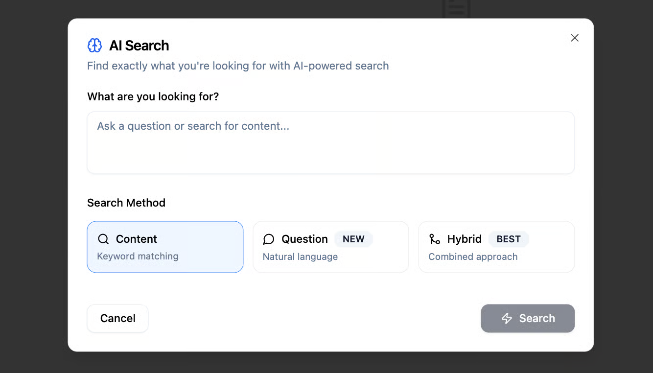 - Hybrid – a combination of content-based and question-based search.