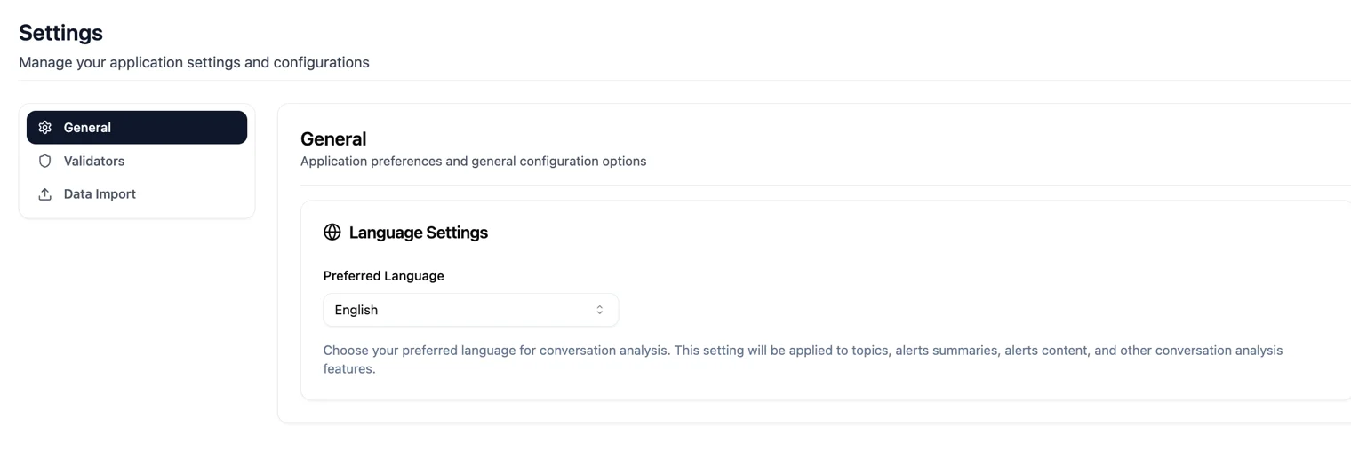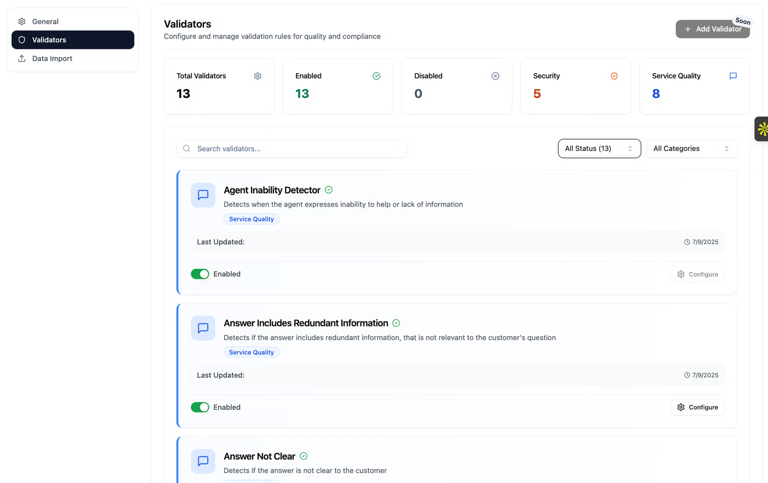 Under Validators, you can view all the available validators that are applied to the conversations you upload to the platform. Here, you can choose which validators you want to enable or disable. Each validator includes a short description of its purpose, helping you make informed and professional decisions about which ones to use.