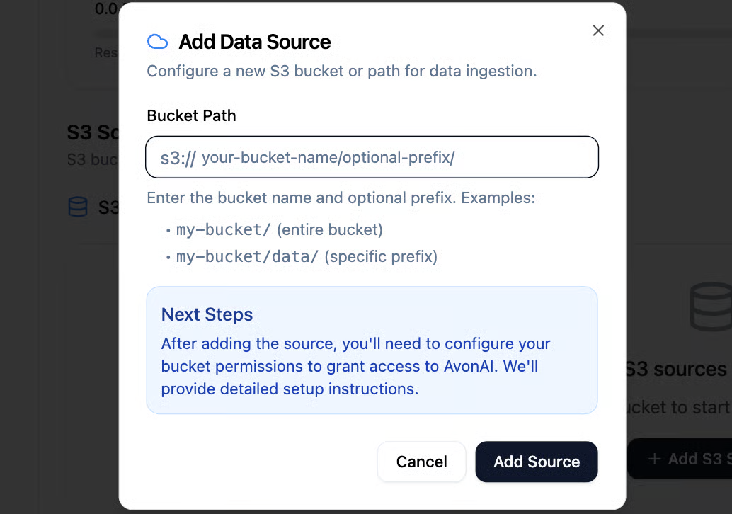 After adding the S3 source, you will be prompted to configure the correct permissions so Avon AI can access your bucket. You will receive step-by-step instructions, including required IAM policy and bucket access settings.
